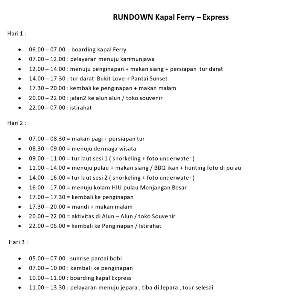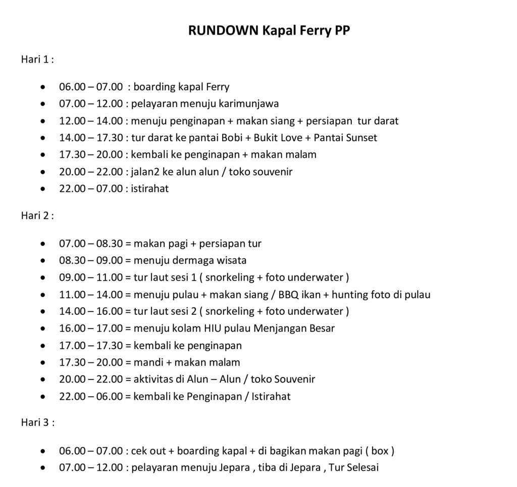 - Tiket kapal Jepara – Karimunjawa PP ( sesuai paket )